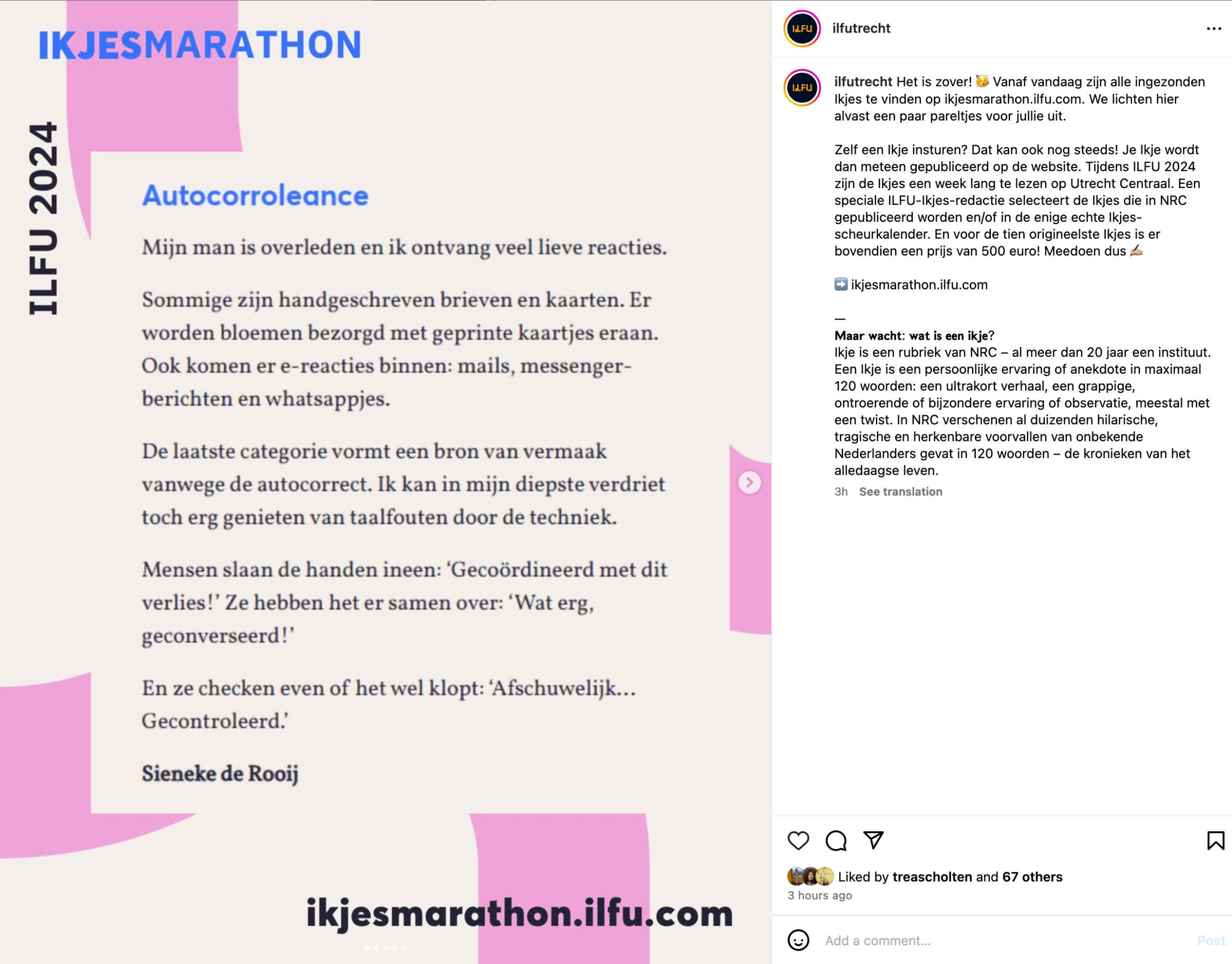 In 2024 won ik twee prijzen bij de Ikjesmarathon van het Ilfu. De Ikjes verschenen in de NRC en op de speciale Ikjes-Scheurkalender van Ilfu. Mijn tekst Autocorroleance maakte veel los.